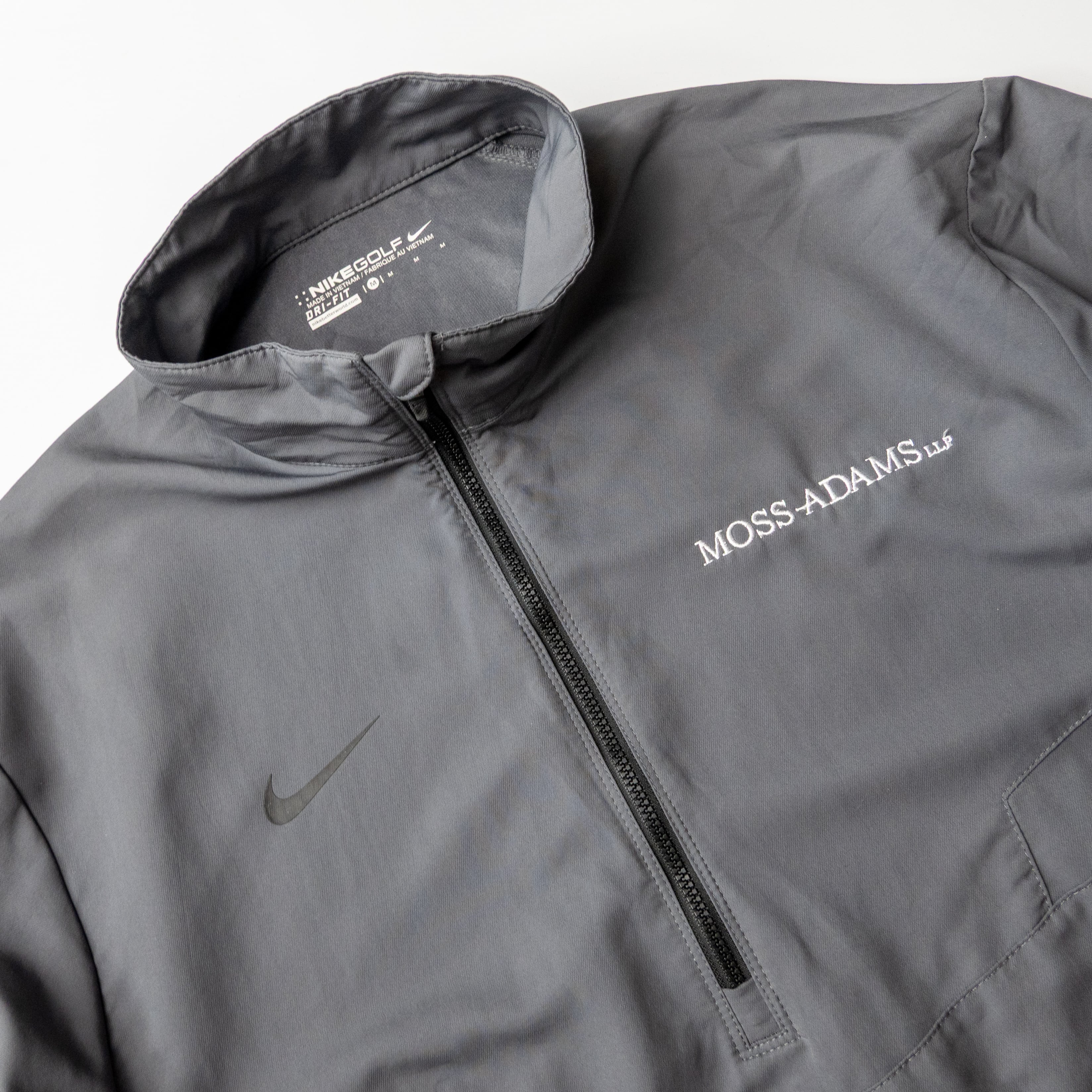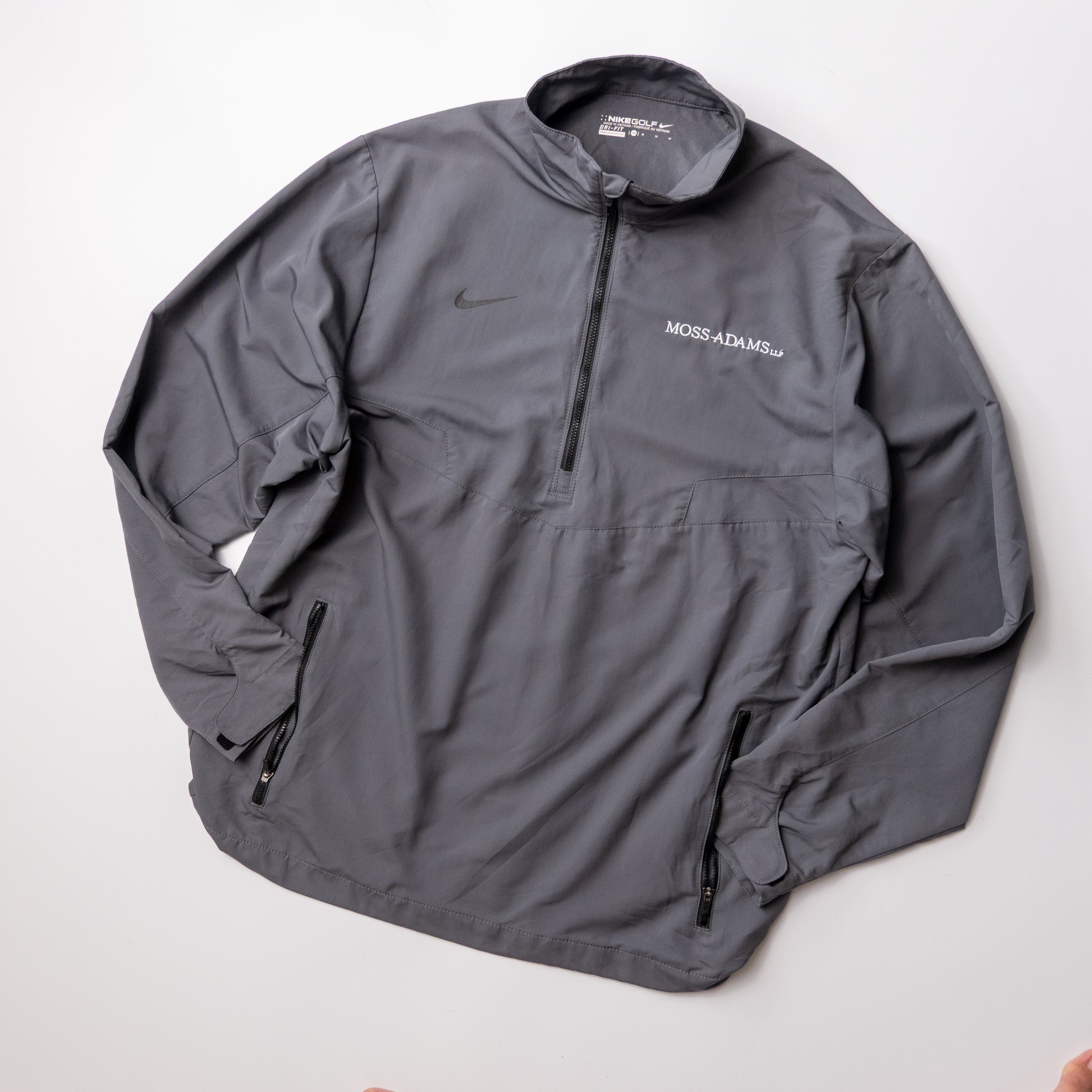右胸にスウッシュ、左胸には大手会計事務所MOSS ADAMS LLPのロゴがアクセントに。企業ロゴがスタイリングのアクセントに。