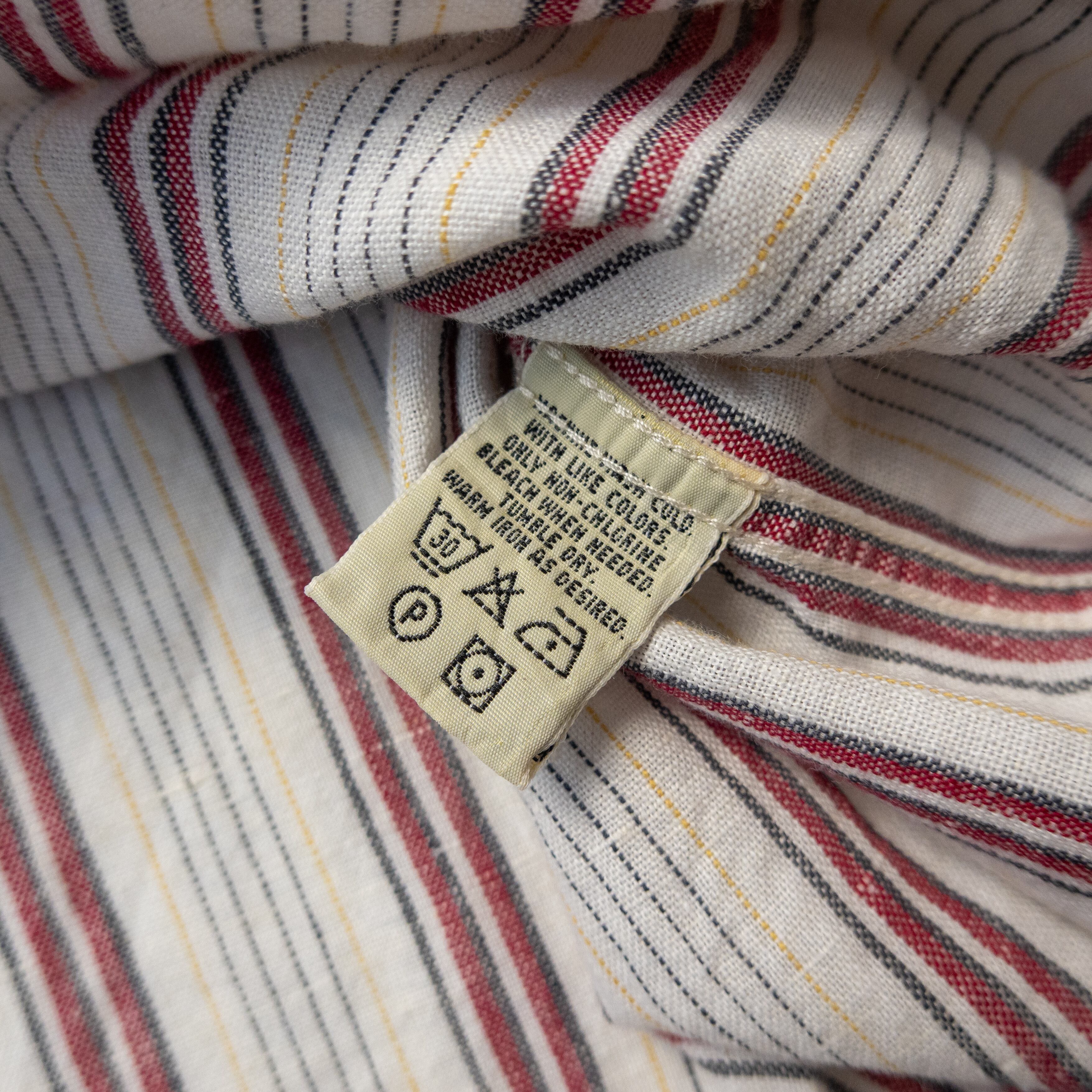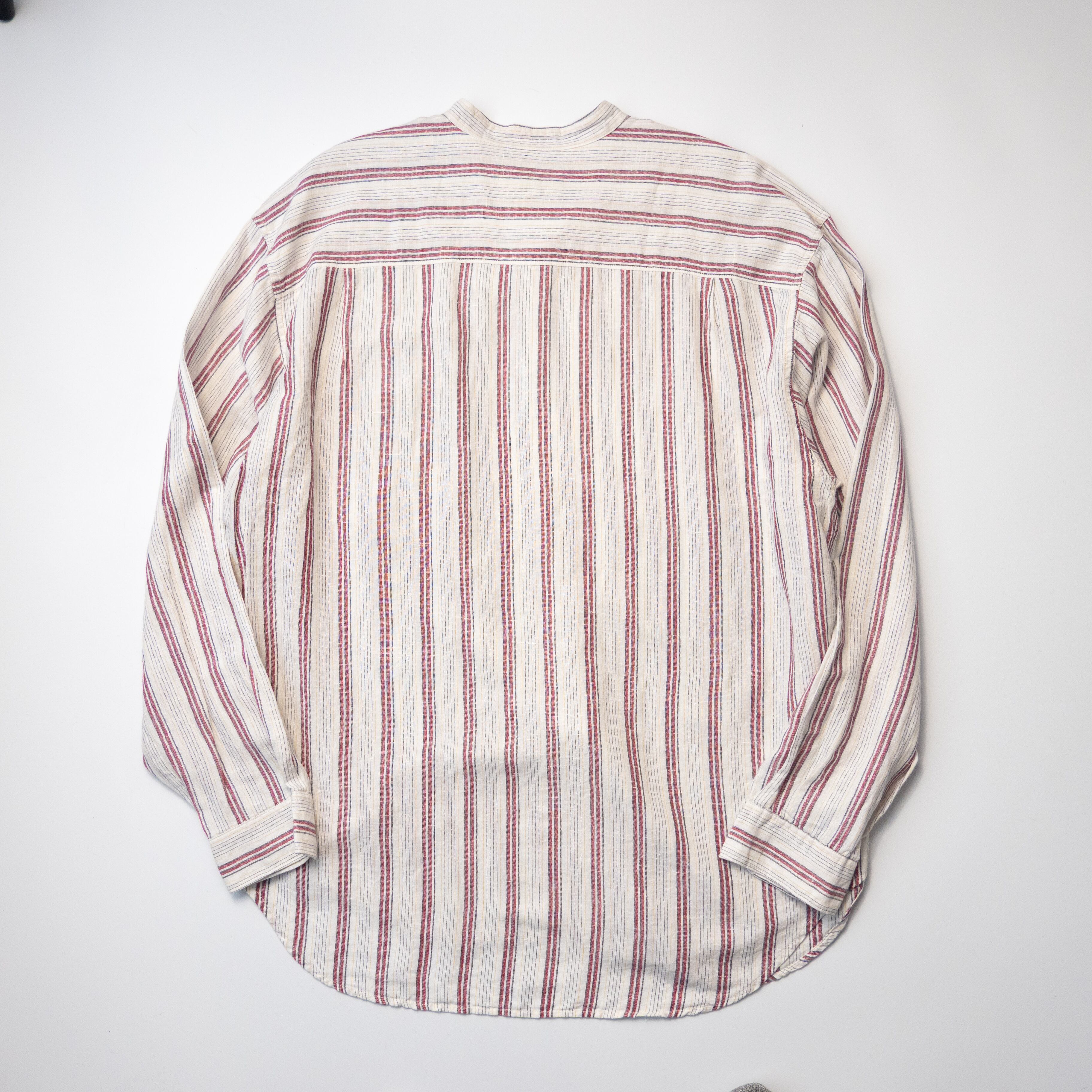 白ベースに赤ストライプを乗せた、バンドカラーシャツ。