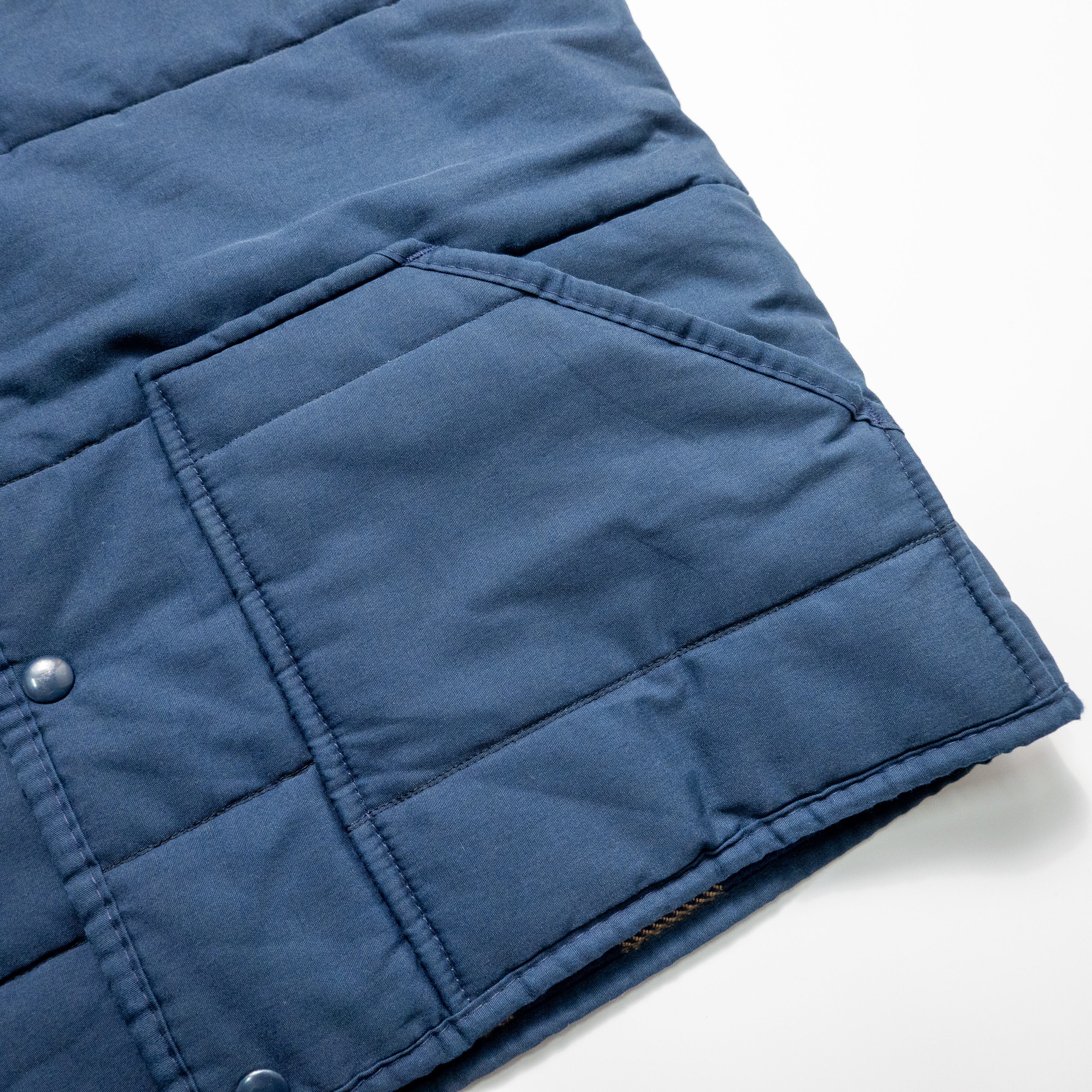 BIG YANKの派生ラインとして展開されたSPORTABOUTSらしい、アウトドアテイストを感じるベスト。落ち着きのあるブルーカラーに、裏地のイエロー×ネイビーのチェック柄がアクセントとなり、脱いだ時や動いた時にも雰囲気を楽しめる一着です。