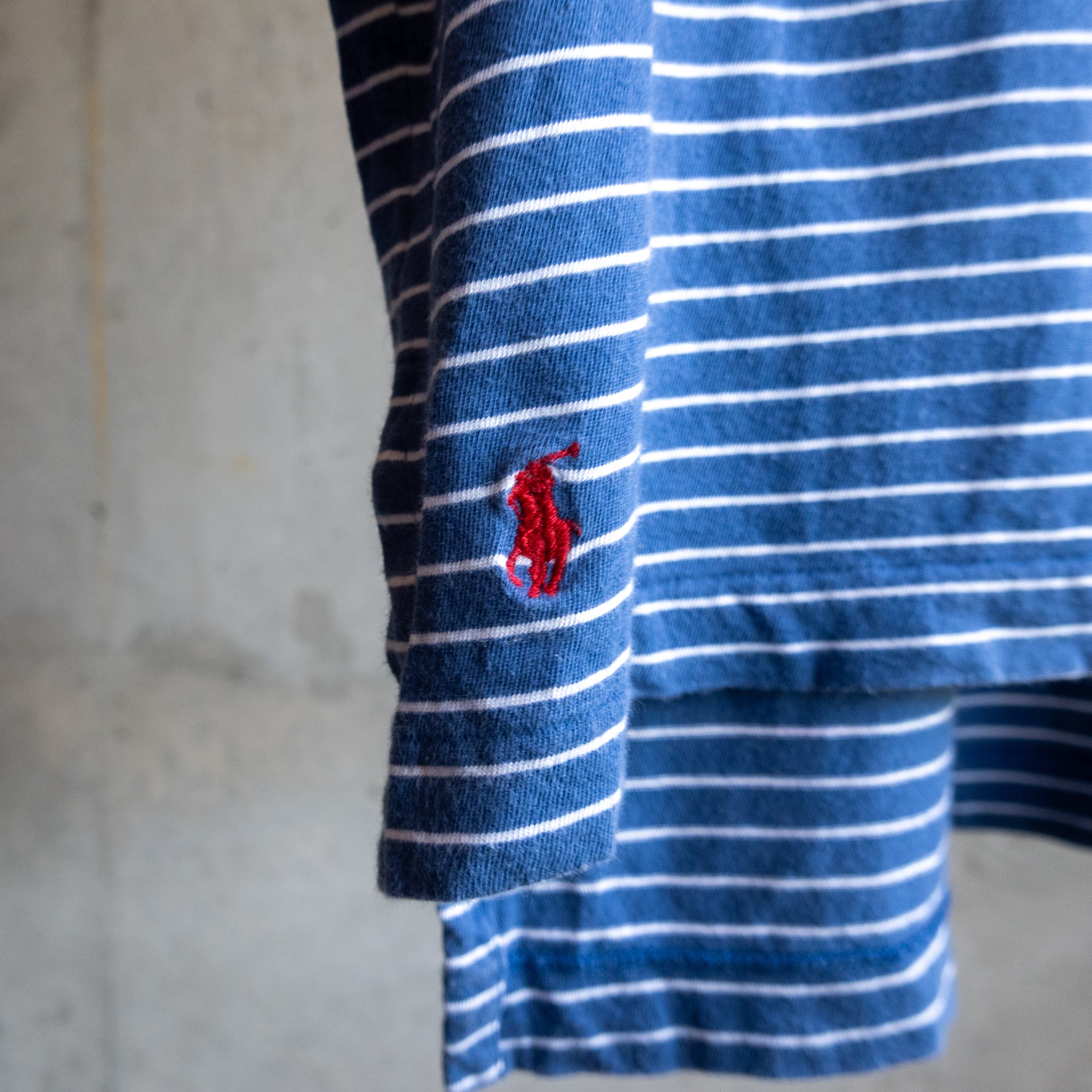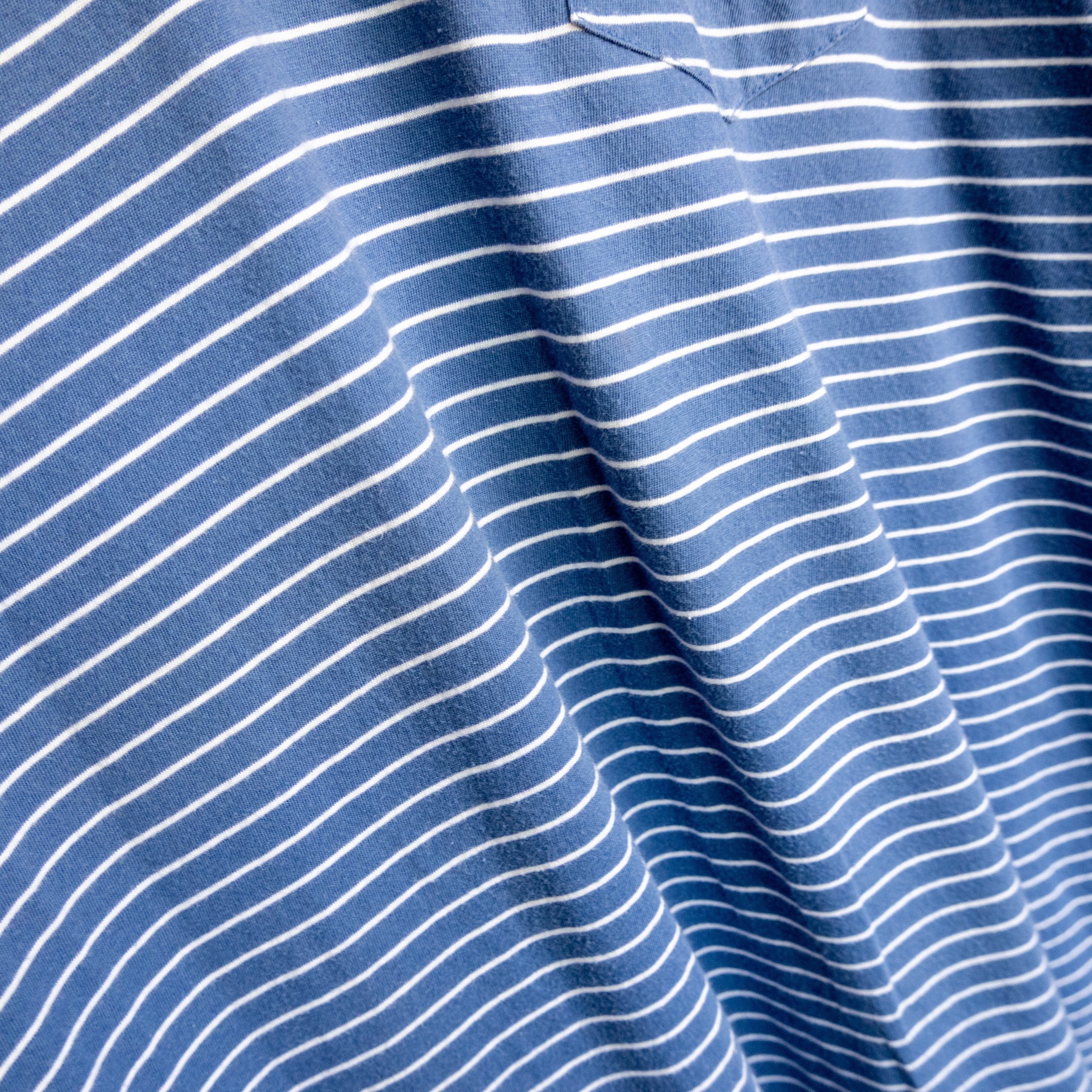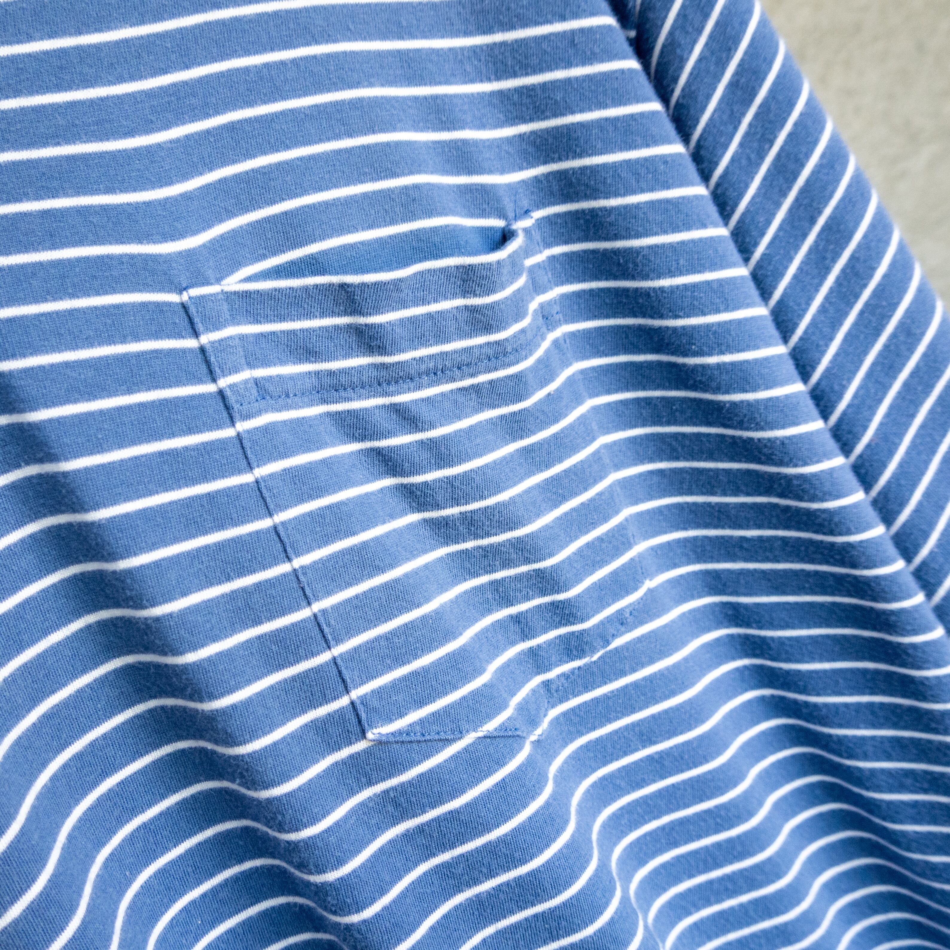 主張が少なめなカラーリングのボーダーポロシャツ、今夏のワードローブにいかがでしょうか。