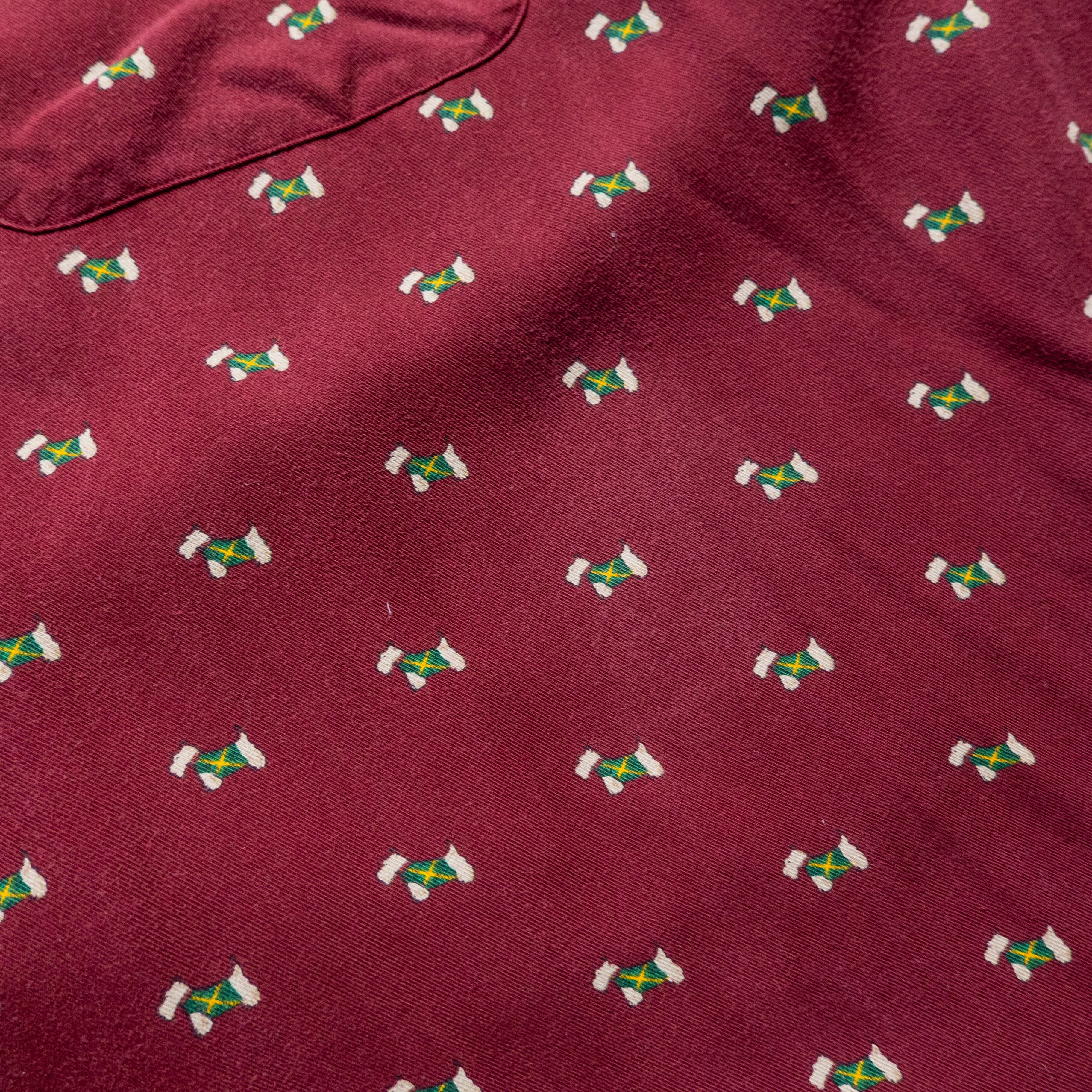 深みのあるバーガンディーカラーに、さりげなく散りばめられた犬柄がアクセント。