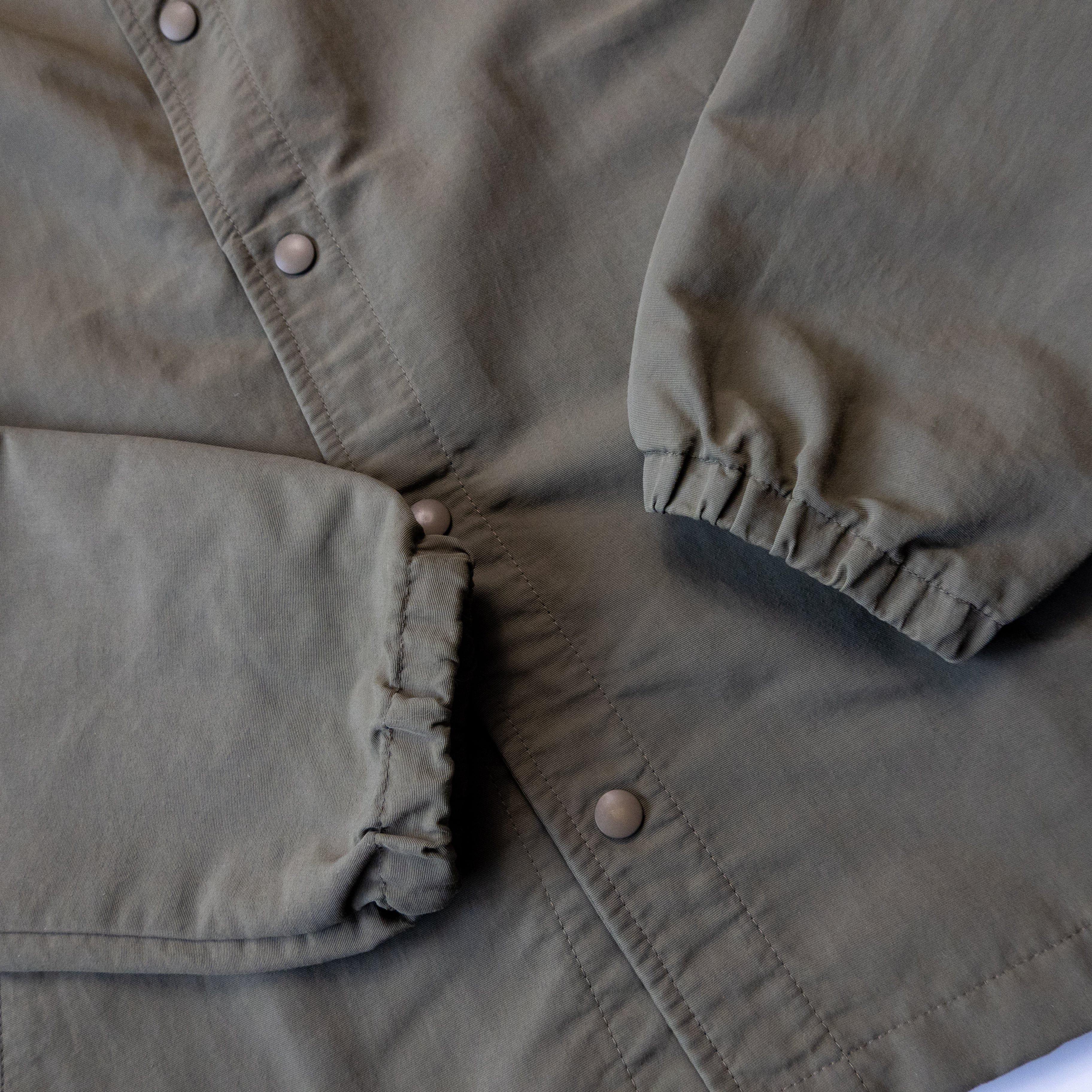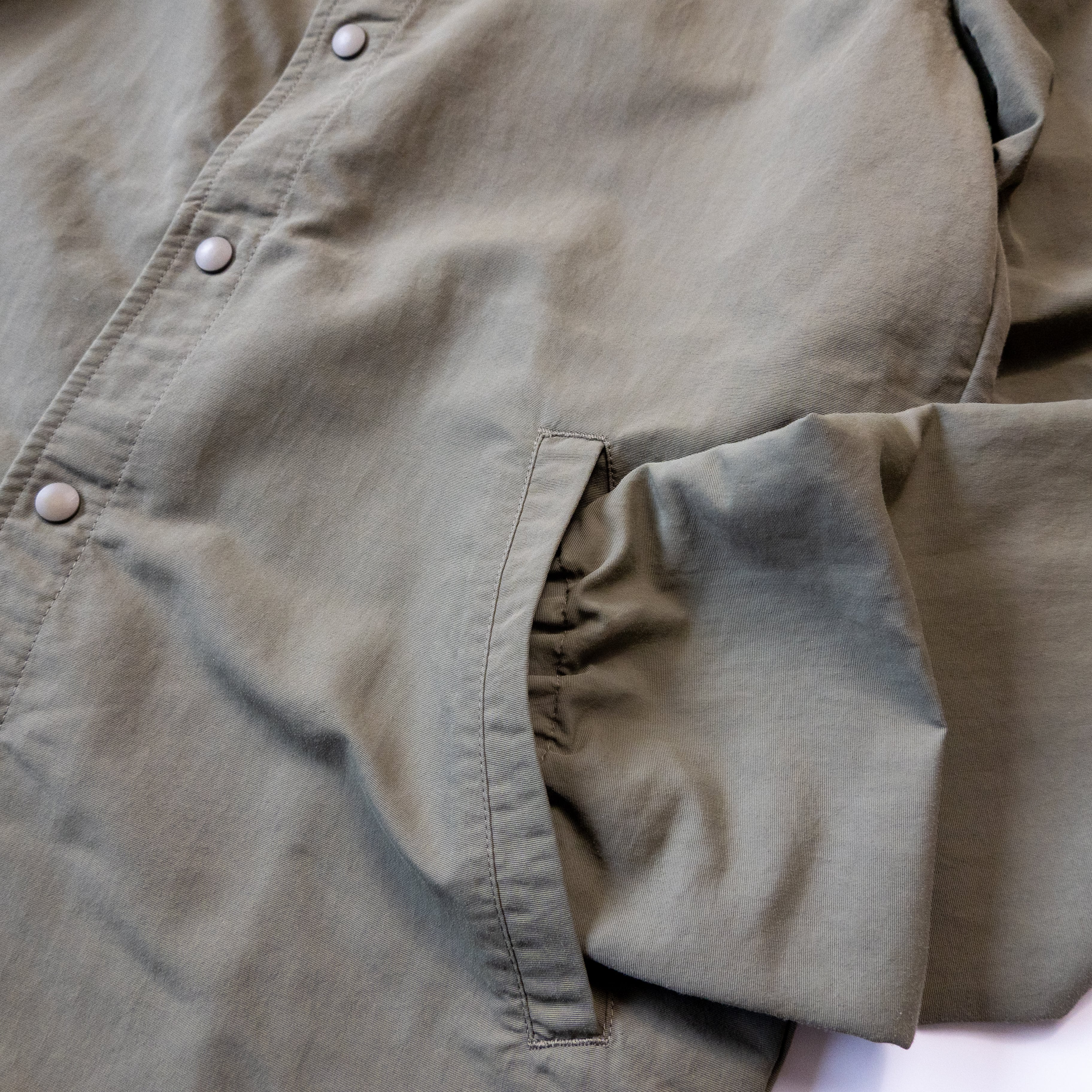 無地カーキカラーにスナップボタン仕様、裾にはドローコード