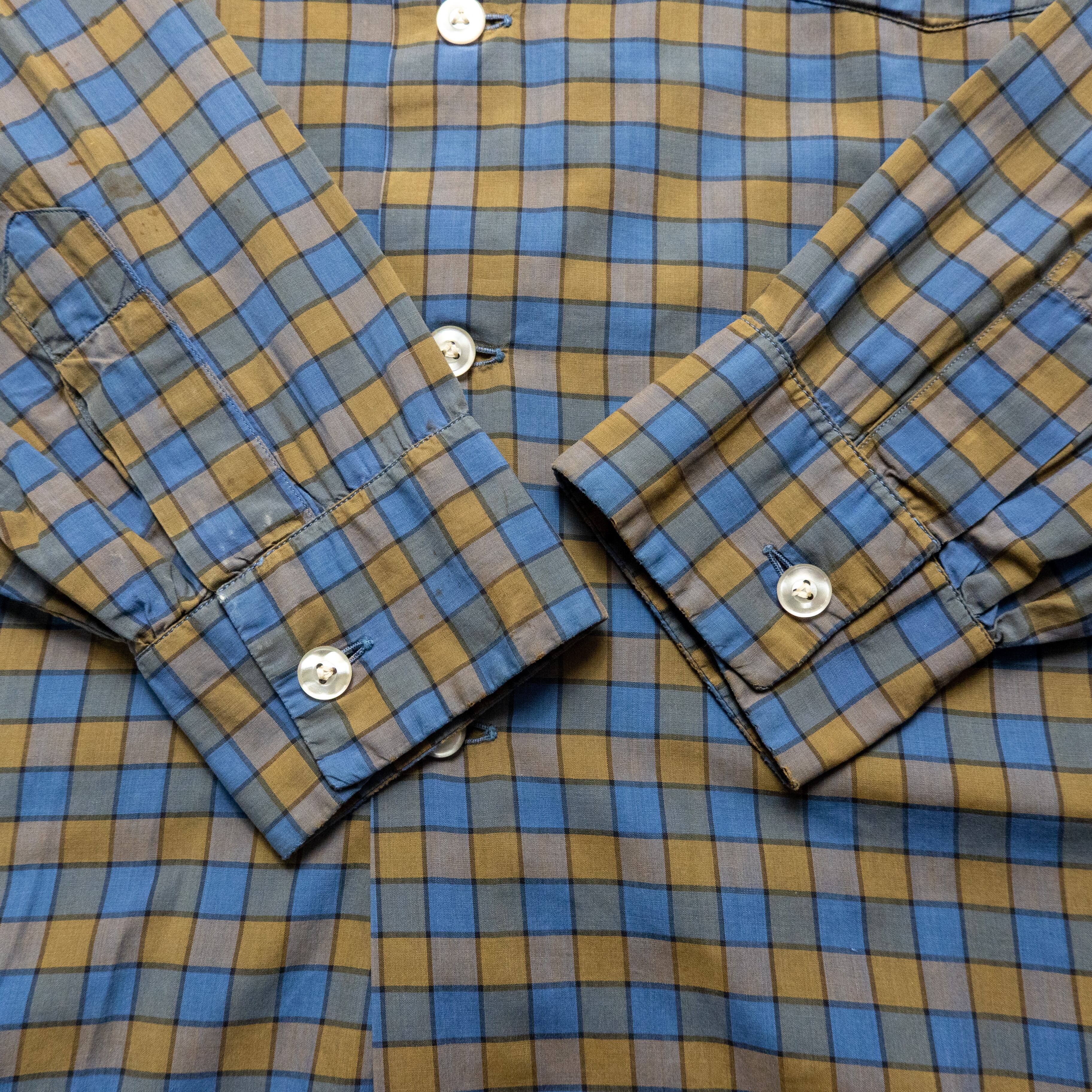 くすんだチェック柄にブルー・オレンジのグッドな配色ゆとりあるボックスシルエットに、オープンカラー仕様